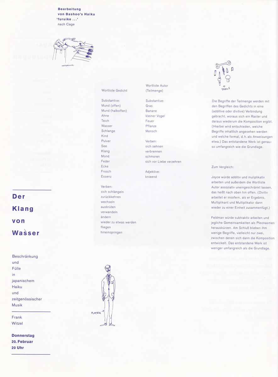 Der Klang von Wasser Beschränkung und Fülle in japanischem Haiku und zeitgenössischer Musik Vortrag Mousonturm Frankfurt, 20. Februar 1997 |
